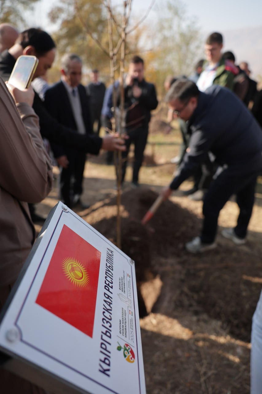 В завершении выездного мероприятия под руководством заместителя министра образования и науки Республики Таджикистан Бадриддина Музаффарзода участники II Международного форума СНГ по школьному питанию высадили яблоневые и грушевые деревья с табличками своих стран, заложив на приусадебном участке школы в Нуреке «Сад Дружбы».